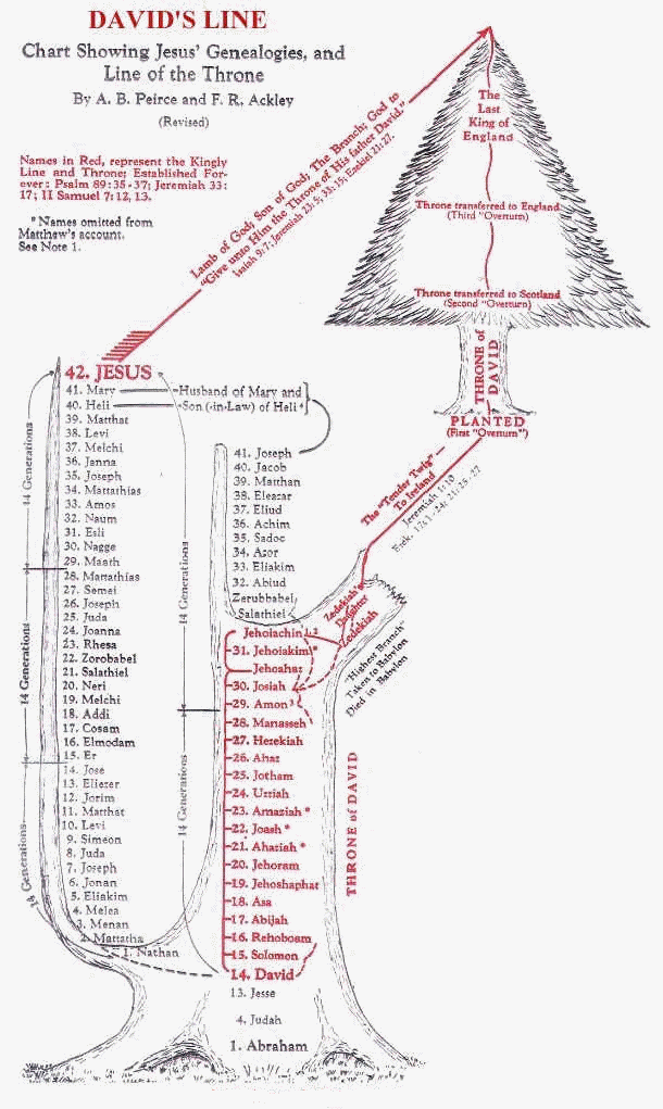 Next year is the 700th anniversary since the last overturn. How ironic and poignant that after 700 years only now do we see the prospect of the fall of the House of Windsor. The prophesy comes full circle in that, instead of there being two Princesses as survivors, there are now two Princes. The coincidences mount. 1996 is the 3,000th anniversary of the founding of Jerusalem by King David. 4,004 B.C., 1,004 B.C. 4 B.C. 1396 A.D. 1,996 A.D. ...... The legends state that the chest that Jeremiah brought to Ireland contained the Ark of the Covenant. That chest is buried in a mound next to the Irish Queen Tamar Tephi at Tara and to date there is no evidence that this mound has ever been excavated. Maybe next year to coincide with the excavations at Djaharya.