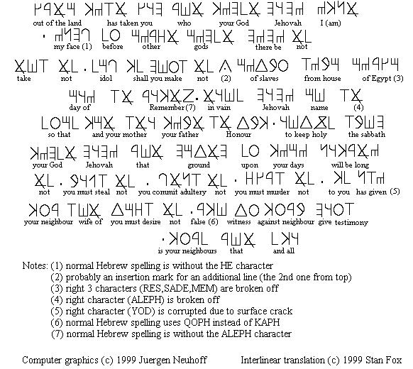 The above inscription cannot be a fake for the following reasons. The actual time of discovery of the inscription is not known but was known by the locals as far back as the 1850's. At that time, the script of the text was unknown and therefore undecipherable. It was not until this last century that the ancient Hebrew (paleo-Hebrew) script was discovered in the Near East. Once this ancient script was discovered the Los Lunas inscription could be deciphered and was found to be a copy of the Ten Commandments.