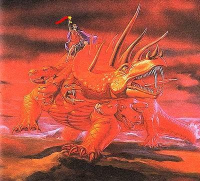 3 So he carried me away in the spirit into the wilderness: and I saw a woman sit upon a scarlet coloured beast, full of names of blasphemy, having seven heads and ten horns.