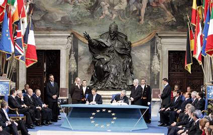 British Prime Minister Tony Blair, signs the EU Constitution in the Campidoglio, the political and religious center of ancient Rome, and current home of Rome's city hall. Oct. 29, 2004
