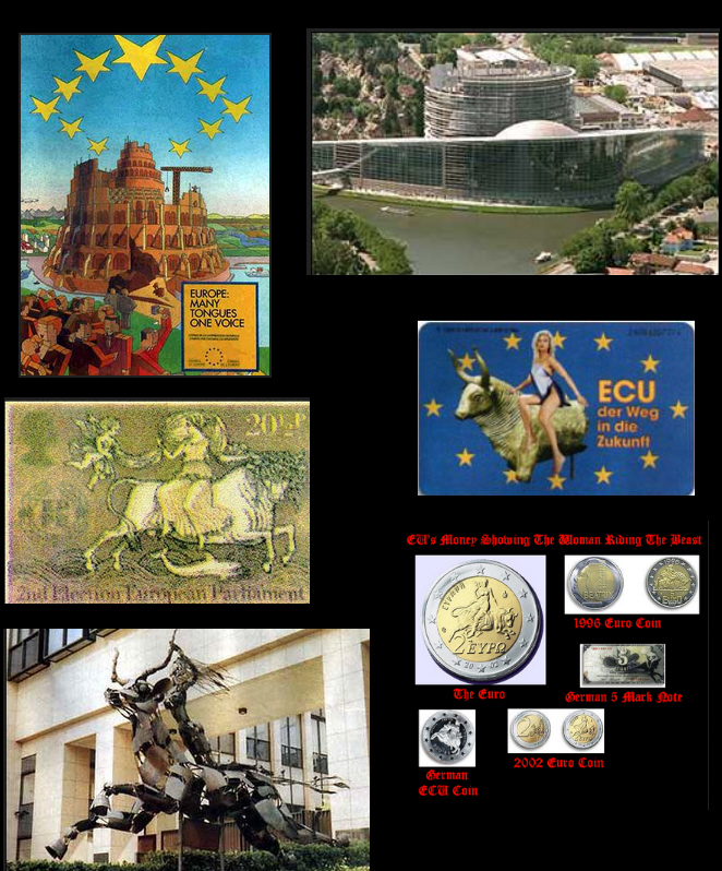 Claimed to be bu6ilt in the image of the Tower of Babel... The Eu (European Union) portrays the woman riding the beast everywhere... EU Stamp, EU Phone Card, EU money, Sculpture outside the Council of Ministers Office in Brussels, Belgium,