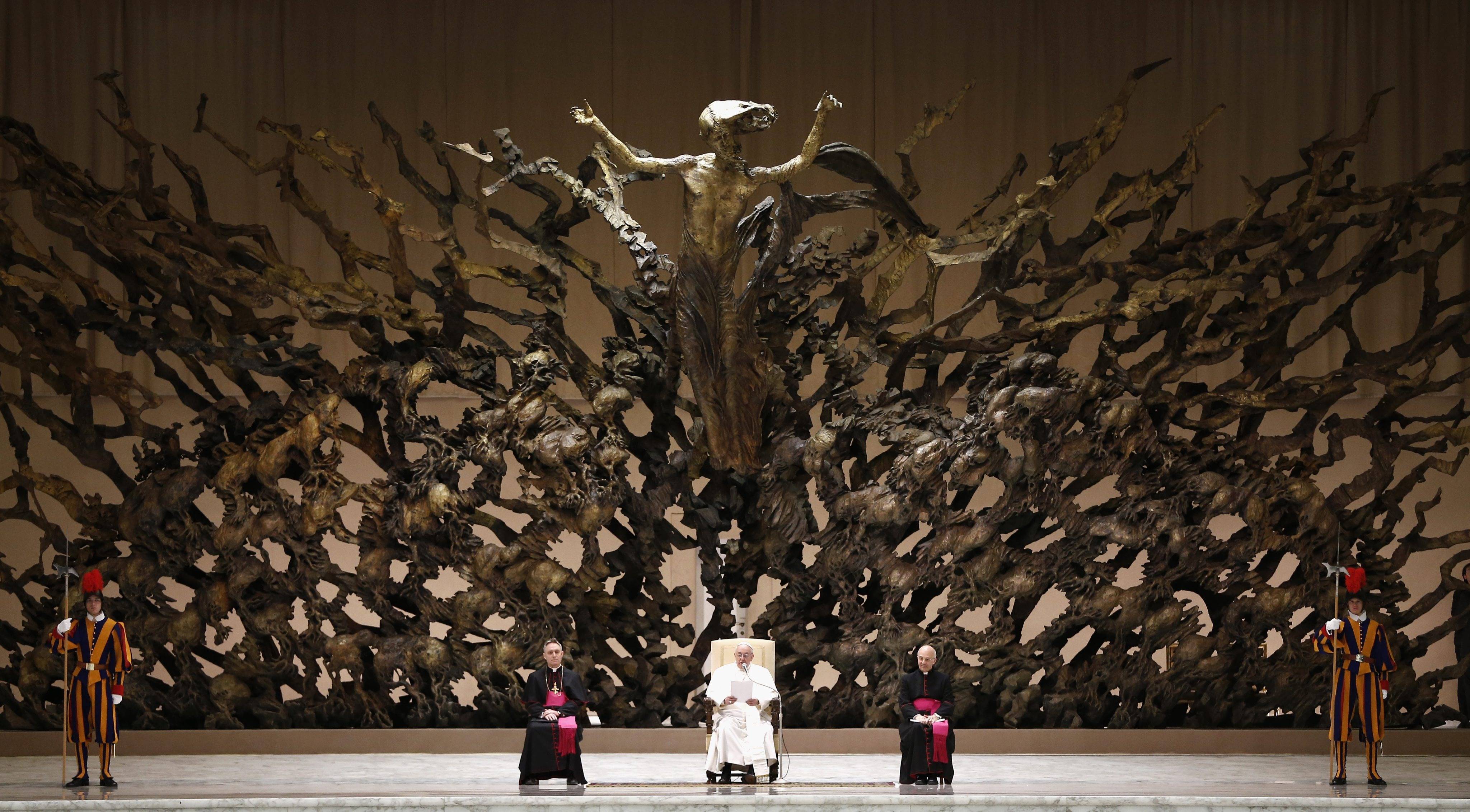 The pope says it is suppose to depict Christ's resurrection after a nuclear meltdown... Which is crazy in itself... That's definitly weird... It looks more like the martyred saints they've killed through the centuries that are in the Catholic Skull Chapel...